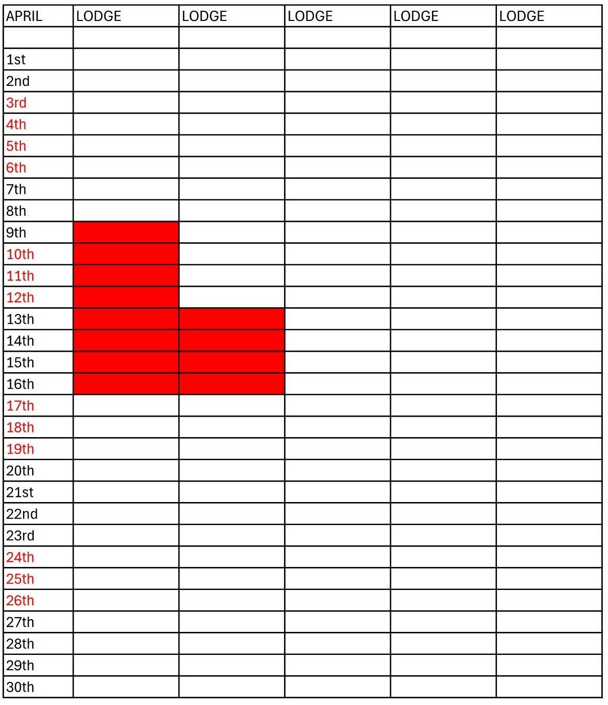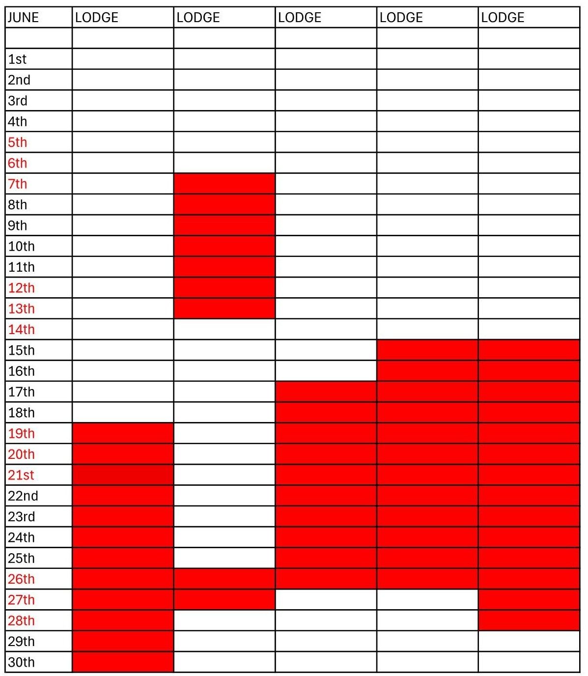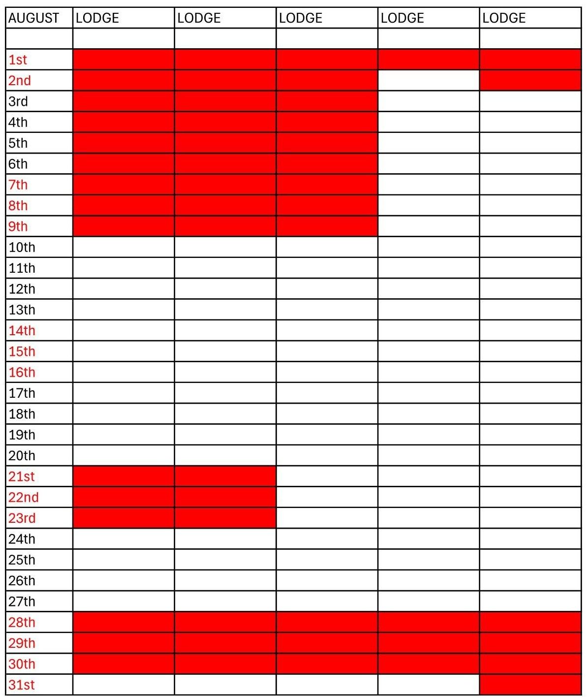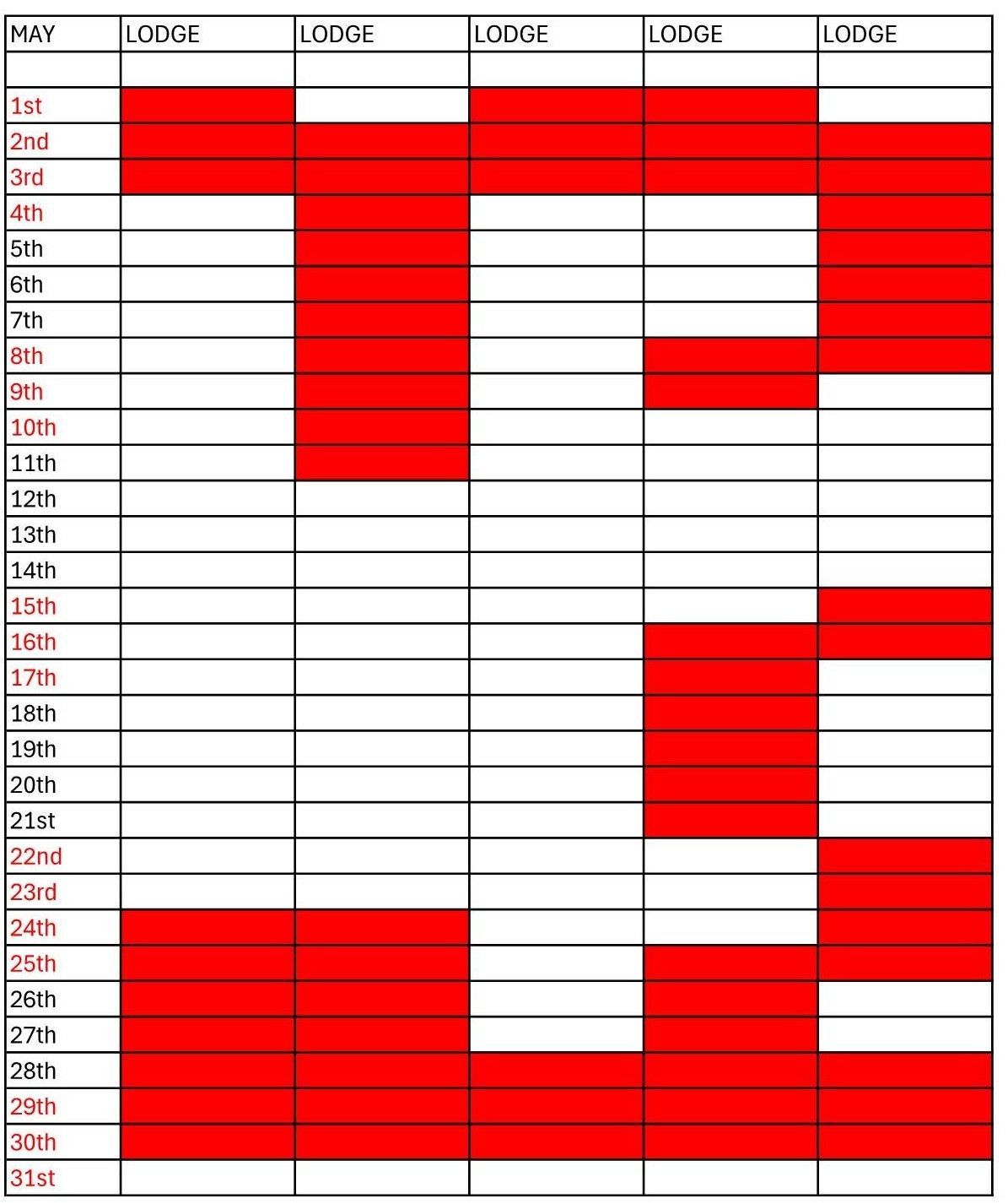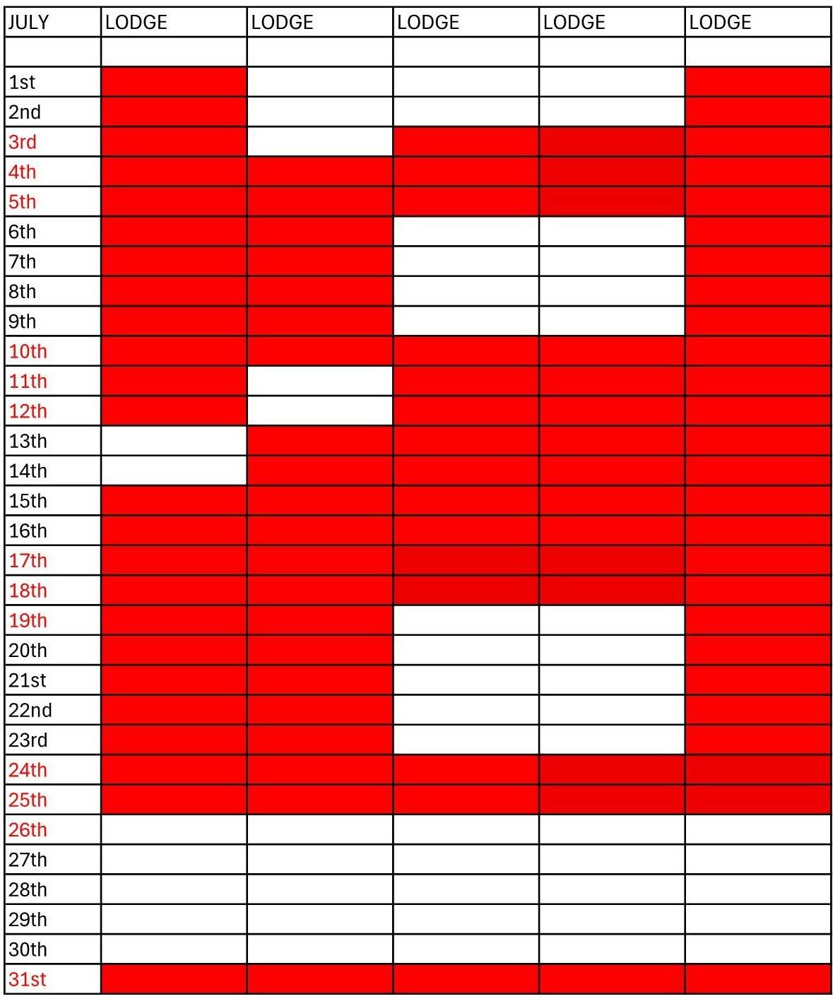 On the month displays red means Occupied white Free.